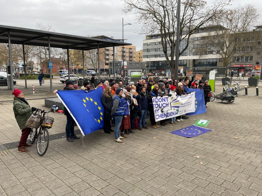Die angemeldete Demo gegen die seit Juni 2024 wieder ständigen Grenzkontrollen, hat auf Initiative der Jungen Europäer – JEF Baden-Württemberg am 23.11.2025 im Zeitraum von 14.00 Uhr bis etwa 15.00 Uhr am Bahnhof in Kehl stattgefunden.
